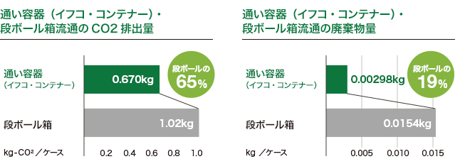2008年、京都府立大学人間環境学部環境デザイン学科による興味深い研究分析報告書が発表されました。それによると、イフコ・コンテナーのような通い容器のCO2排出量は、ワンウェイの段ボールに対し約35%、廃棄物量に至っては約81%も少ないという算出結果が報告されています。