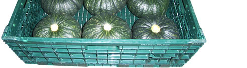 7〜8月に出回る夏カボチャは意外と傷みが早いので、出荷には通気性が良く予冷が効くコンテナ流通が最適。品質保持が良いので市場や量販店からも評価されています。
